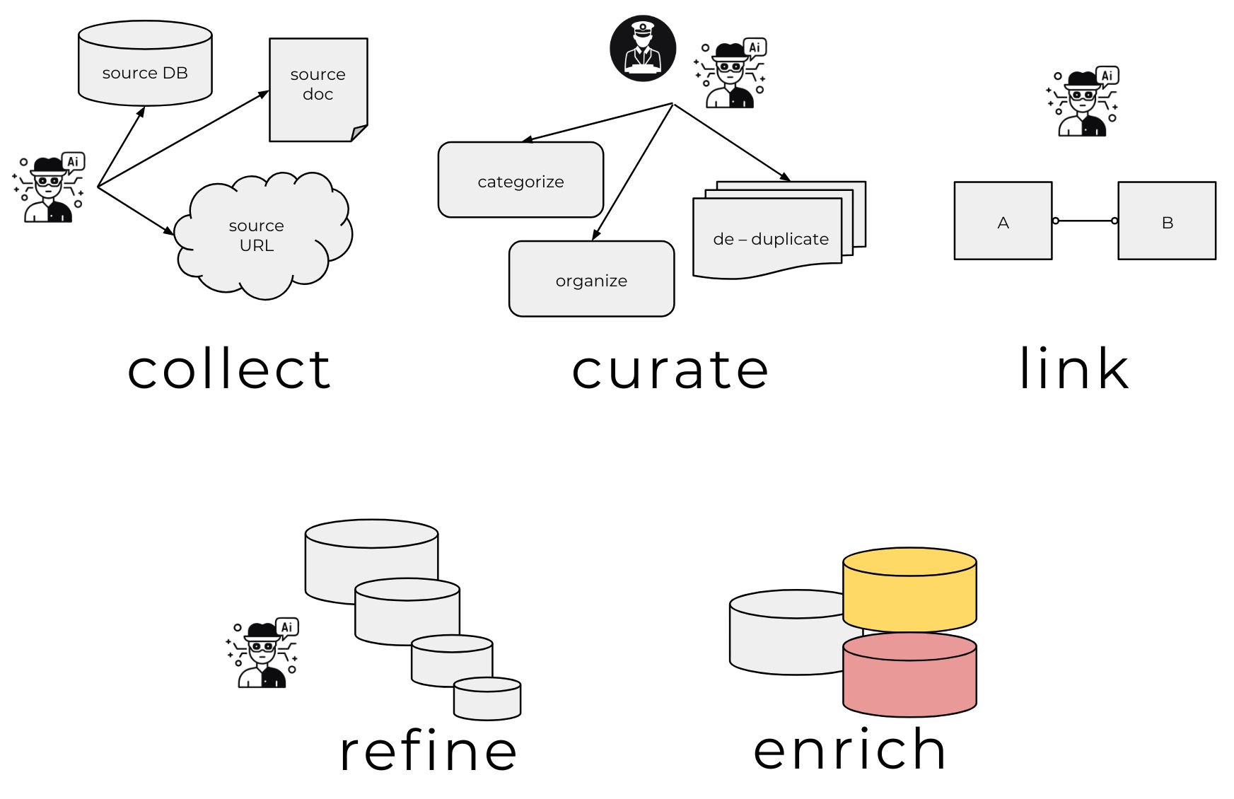 These AI agents perform five critical functions that build our Knowledge Graph. First, agents collect raw data from both public and private sources. We then curate this raw data by categorizing, de-duplicating and organizing the raw data. Next, agents link objects to each other, creating a graph of relationships that informs Chkk’s platform and enables product features like our upgrade and version recommendation engines. After the graph of relationships is built, agents refine the curated data and relationship links by doing deep research and validation on previously-discovered facts. Finally, a set of agents works to enrich the refined data and relationships by adding additional context to data models.